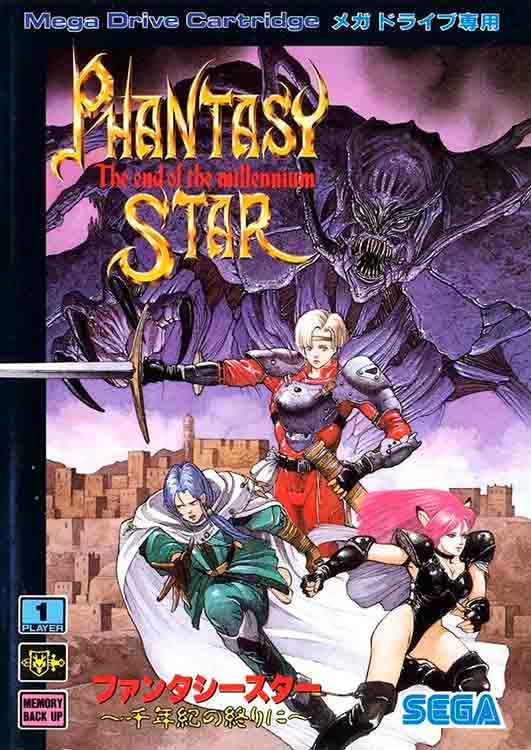 Portada del Phantasy Star: The End of the Millenium original (1993), del que fue la líder Rieko Kodama. En el centro, el protagonista, Chaz Ashley, junto a Rika (derecha) y Rune Walsh (izquierda).