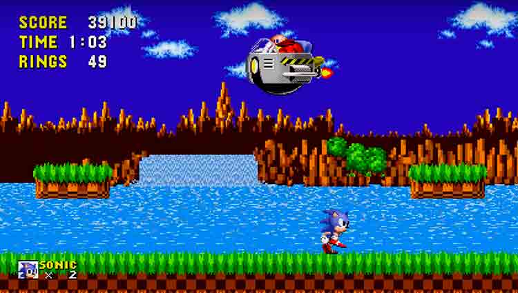 Sonic en su primer enfrentamiento contra el doctor Eggman (Ivo Robotnik) en el tercer acto de Green Hill Zone, del primer Sonic (1991, Mega Drive). Rieko Kodama fue una de las responsables de lo que veis.